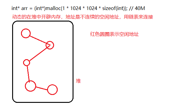- 堆(是用链表来存储的空闲内存地址的,是不连续的):占用内存空间最大值 80% ,开辟内存的方式是动态内存开辟 ,不会自动回收必须手动回收(内存不再使用的时候一定要手动回收)