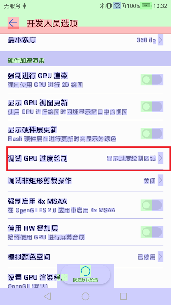 手机端的开发者选项—>调试GPU过度绘制—->显示过度绘制区域