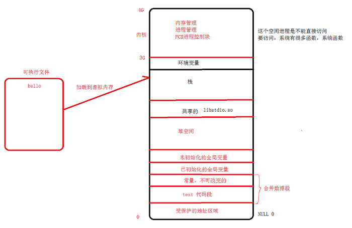 每个进程都有4G的虚拟地址空间,其中3G用户空间,1G内核空间(linux),每个进程共享内核空间,独立的用户空间: